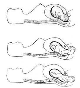 1. Первый момент биомеханизма родов — сгибание головки плода и ее вставление во вход в малый таз. При полном сгибании головка входит в малый таз своим наименьшим размером. Прохождение головки через плоскость в ходе в малый таз (крестцовая ротация) начинается в I периоде. Первый период завершается полным раскрытием шейки матки. Ось родового пути, который предстоит проделать ребенку, похож на рыболовный крючок.