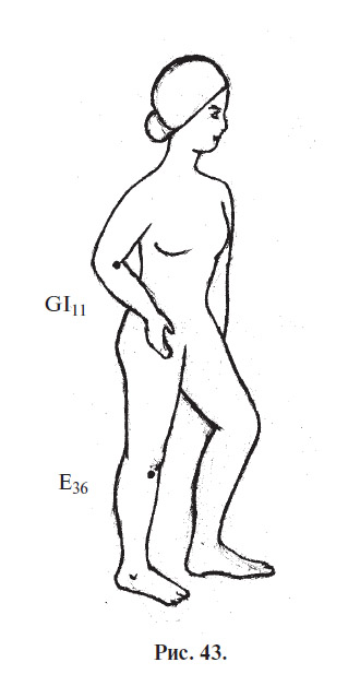 1. Восстановление сил. Для этого домашние должны освободить мать от всякой работы, кроме пребывания с ребенком. Прежде всего нормализуйте режим отдыха, питания. Проведите общеукрепляющие процедуры. Например, прогревание точек долголетия (рис. 43) на ногах (Е36) и на руках (GIn) — по 5 мин. каждую точку (один день Е36, один день — GIn).