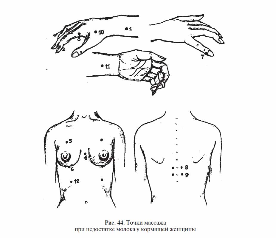 4. Эффективен самомассаж точек по В. С. Ибрагимовой (эти же точки можно прогревать перед кормлением, не прикасаясь к телу, свечой или полынной сигарой. Особенно точки на грудной клетке и на спине. Молоко прибывает сразу же после прогревания)