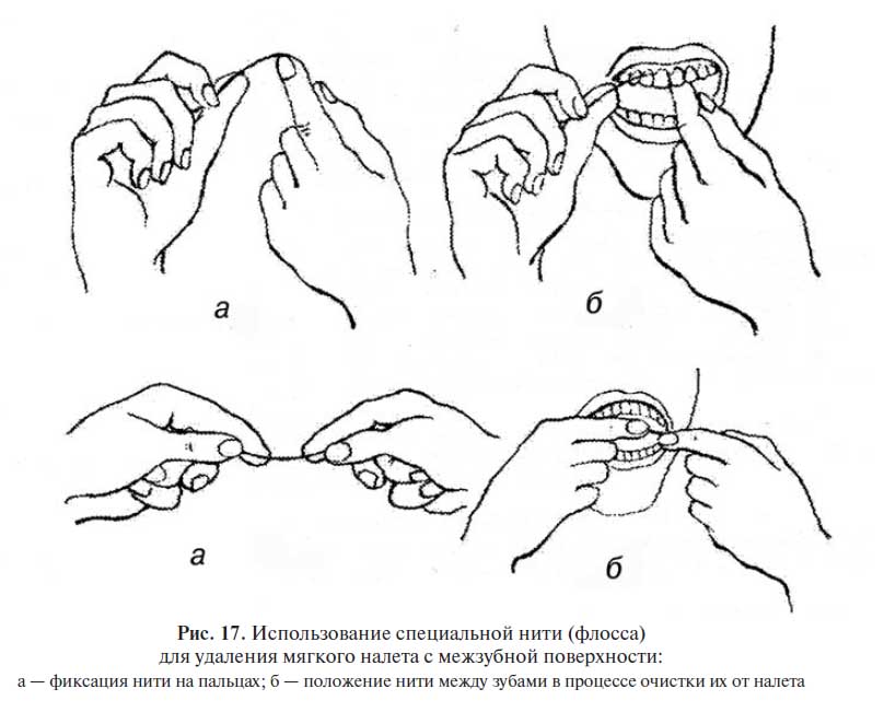Промежутки между зубами чистят нитями — флоссами со специальной лечебной пропиткой. Нить наматывается на средние пальцы рук (рис. 17а), натягивается и вводится между зубами до десны, затем движением к краю коронки очищается промежуток между зубами (рис. 17б). Можно использовать специальные приспособления для фиксации этой нити.