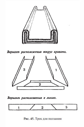 Фанерный желоб имеет ширину в 40,5 см без учета оклейки поролоном. Внутренний слой поролона толщиной в 2,5 см несколько сокращает ширину трека. Углы к наружным краям постели — 45°. В течение дня желоб-трек устанавливается под разным углом, ориентируясь на силы и настроение ребенка. Угол наклона должен быть таким, чтобы ребенку хотелось двигаться. Имейте в виду, что дети часто громко кричат во время ползания. Таким образом они обеспечивают себе глубокое дыхание при нагрузке. Для ползания можно использовать простой матрас, уменьшая угол его наклона. Постепенно ребенок начнет ползать по горизонтальной поверхности. В три месяца он уже может выползти из комнаты.